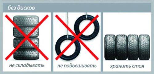 - Колеса без дисков рекомендовано располагать только вертикально. Для этого используются специальные подставки, имеющие полукруглое основание. Несколько шин можно расположить плотно друг возле друга, но обязательно такая резина должна проворачиваться через определенные промежутки времени.
