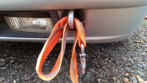 - Тросы с карабином цепляют к проушине, причем левой от машины буксировщика и правой – от авто буксируемого. При данном варианте буксировки трос будет размещен параллельно оси авто и не сможет мешать движению.