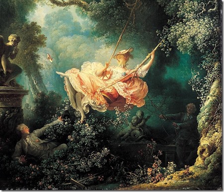 Гедонизм аристократов, бегство в театральный идеализм от реальности. Грациозность, изящество и легкость, интимное кокетство. Пышность позолоты с голубым, розовым, зеленым. Писали Ватто и Буше, Фрагонар, Аргунов, Натье.